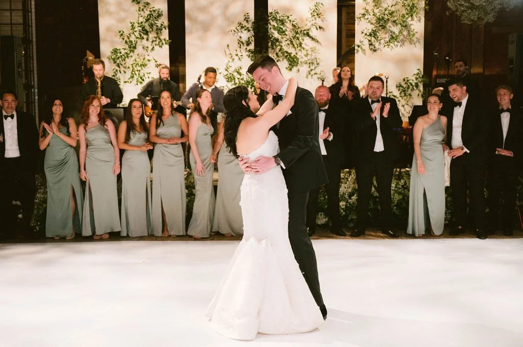 The wedding day kicked off with a spirited kickball game on the sports field before Sara and Brad transitioned into preparations. Choosing a traditional approach, the couple waited to see one another for the first time at the ceremony—an emotional moment framed by the lush spring landscape. During cocktail hour, guests enjoyed hors d’oeuvres while browsing a custom seating display that echoed the invitation envelope liners, as the couple captured family and wedding party portraits. Inside the barn, spring truly came to life with blooming cherry blossom branches and a striking installation of baby’s breath clouds floating above the dance floor. A custom vinyl dance floor paired with sage green lounge seating invited guests to celebrate late into the night—culminating in a joyful moment when the couple jumped on stage to sing along with the band.