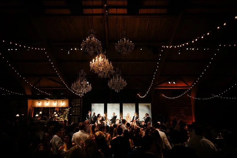 The following morning began with indoor yoga as cool temperatures lingered, before guests warmed up with spirited field day games on the sports field. Max and Gabby shared an intimate first look before capturing portraits on the mountaintop and throughout the property. At the ceremony, guests were welcomed by a meaningful family tree display featuring photos of Max and Gabby’s ancestors on their wedding days—a touching tribute woven into the celebration. Their whimsical, garden-inspired ceremony glowed at sunset beside the lake, followed by cocktail hour in the Pavilion, where guests received personalized cassette tapes featuring songs chosen just for them—each linked to Spotify for easy listening. Inside the barn, the reception burst with summer color, showcasing pastel florals in peach, orange, cream, chartreuse, and pink against teal linens and a coordinating band backdrop. The dance floor filled instantly, and the energy never dipped—an unforgettable reflection of the love surrounding Max and Gabby all weekend long.