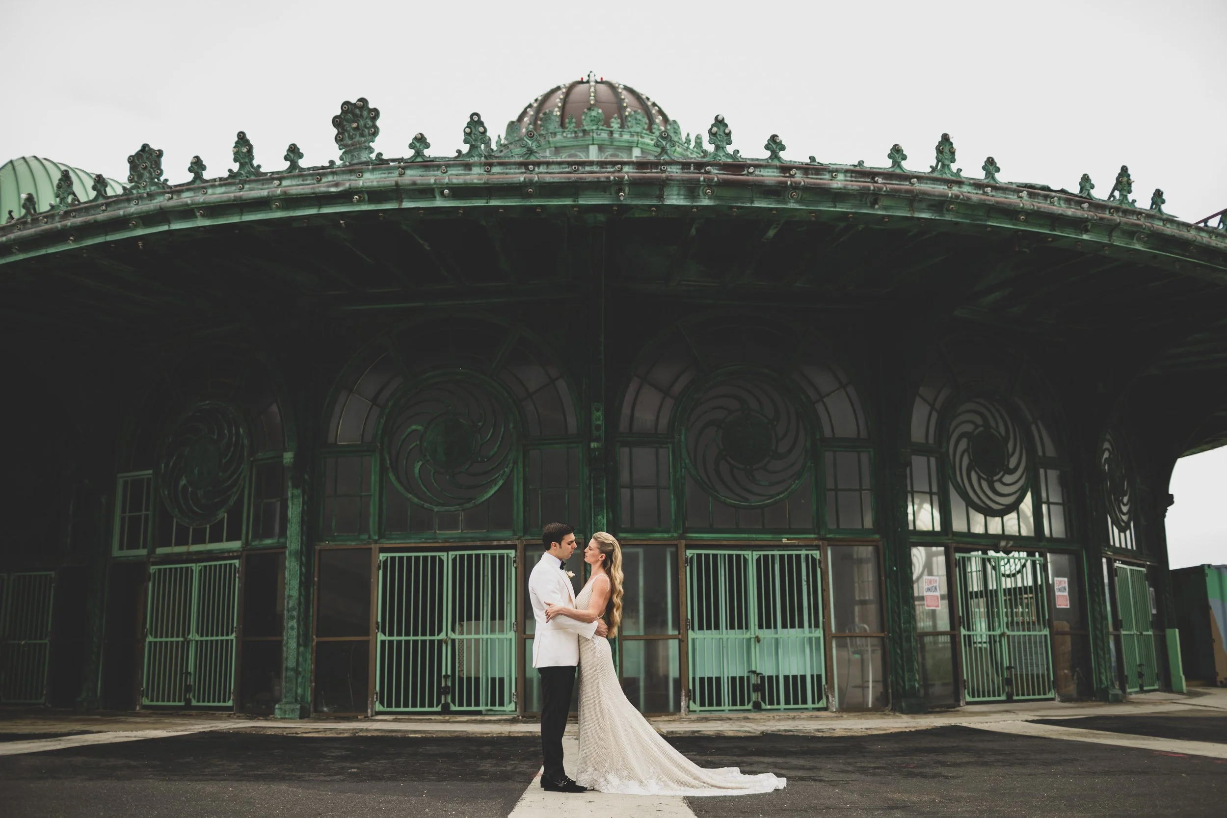 Genevieve and John were married at the iconic Convention Hall in Asbury Park—a legendary venue known for hosting historic musical acts, including Jersey Shore favorite Bruce Springsteen. The day began with preparations at the nearby Asbury Hotel, followed by an emotional first look before the couple headed onto the boardwalk for portraits. Photos were taken in front of the carousel building, recently featured in the biopic Deliver Me from Nowhere, before returning to Convention Hall for their ceremony. The vows took place in the South Overlook, offering sweeping views of the Asbury Park boardwalk and the Atlantic Ocean beyond.