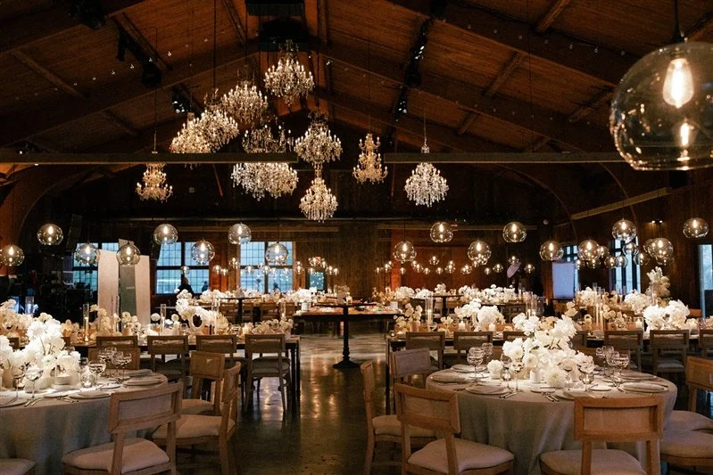 When weather shifted plans for their mountaintop ceremony, a rolling fog enveloped the landscape—creating unforgettable photo moments and an atmosphere all its own. Vendors seamlessly pivoted, moving the ceremony indoors, where guests were welcomed into a warm and intimate setting. Cocktail hour and the reception unfolded in the barn, where custom lighting installations above the guest tables created a romantic, modern glow. Clean, neutral floral centerpieces paired with stone table numbers and curated art panels, used as the band backdrop, added a sophisticated, personal touch. As the night continued, guests danced beneath spinning disco balls on the treehouse deck, rounding out a chic and joyful celebration that proved a little rain can only add to the magic.