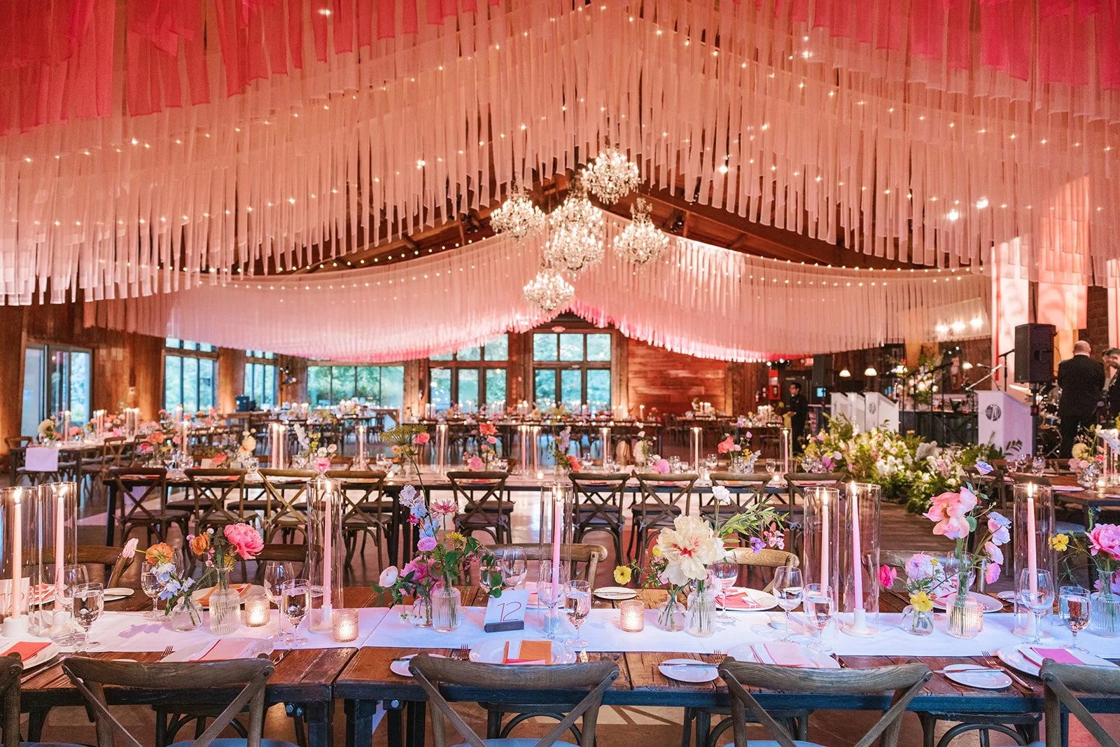 The following morning began with a peaceful yoga session on the treehouse deck as rain gently fell, followed by spirited color wars beneath the tent. The lakeside ceremony featured custom-designed pedestals in assorted modern shapes, each topped with florals that echoed the aisle arrangements. Rain paused just long enough for an emotional ceremony before guests were ushered into cocktail hour on the tented barn patio, where a contemporary, colorful lounge and a record-inspired escort display—highlighting the groom’s favorite albums—set the tone. Inside the barn, guests were greeted by a dramatic fabric installation in ombré shades of pink overhead. Low, vibrant centerpieces allowed the ceiling to take center stage, while a pink band backdrop, white dance floor, and even hot pink, orange, and yellow napkins completed the look. The result was a bold, joyful celebration that perfectly reflected Maggie and Adam’s bright personalities.