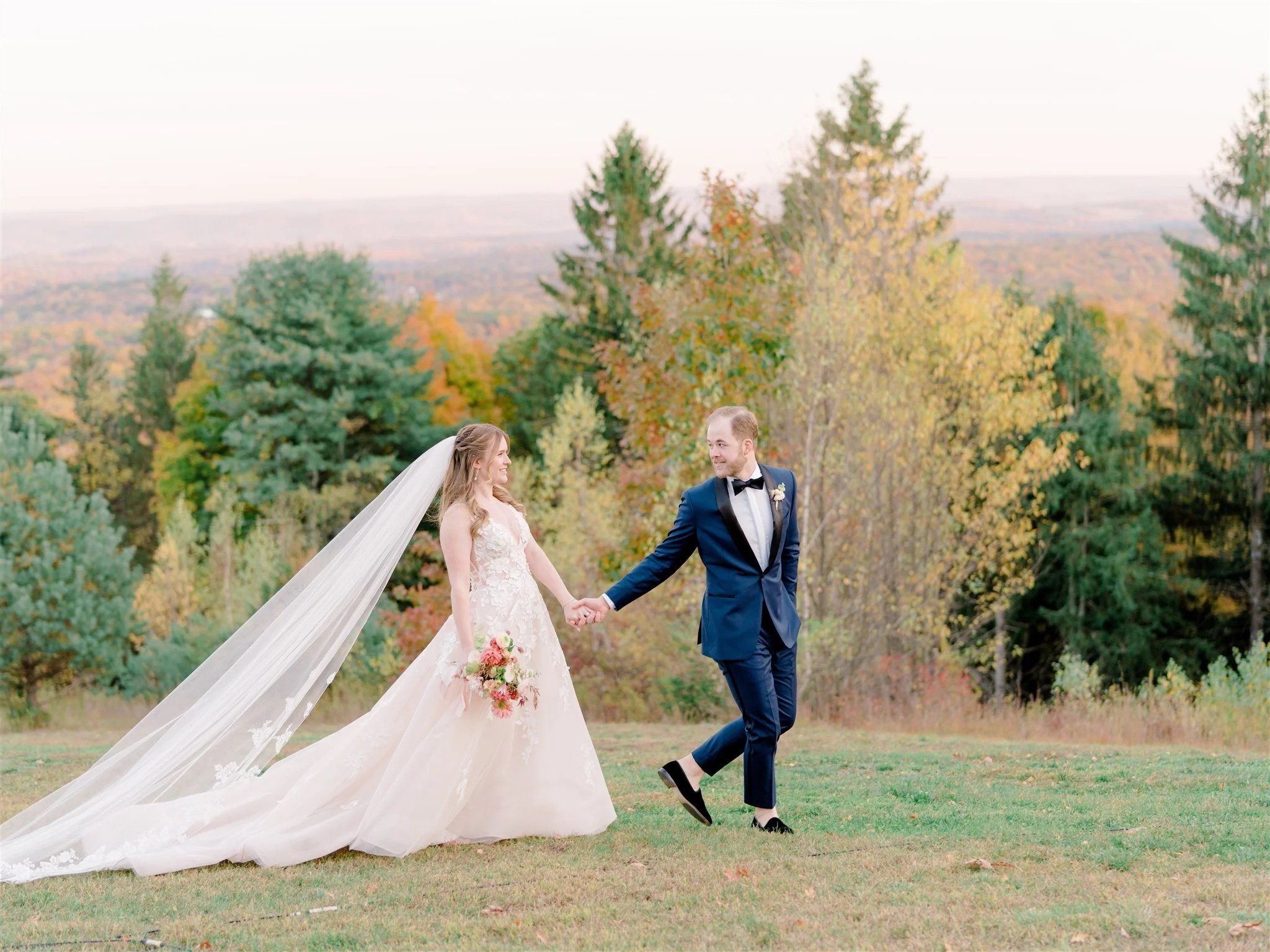 Alex and Clayton were married at Cedar Lakes Estate during peak October foliage in the Hudson Valley, creating a naturally breathtaking backdrop for their fall celebration. Their intimate welcome dinner set a cozy, autumnal tone with pale pastel pumpkins, pillar candles, and long tables designed to encourage meaningful conversation. A seating display featuring hand-calligraphed Cinderella pumpkins and an outdoor lounge in soft fall hues welcomed guests into the weekend.