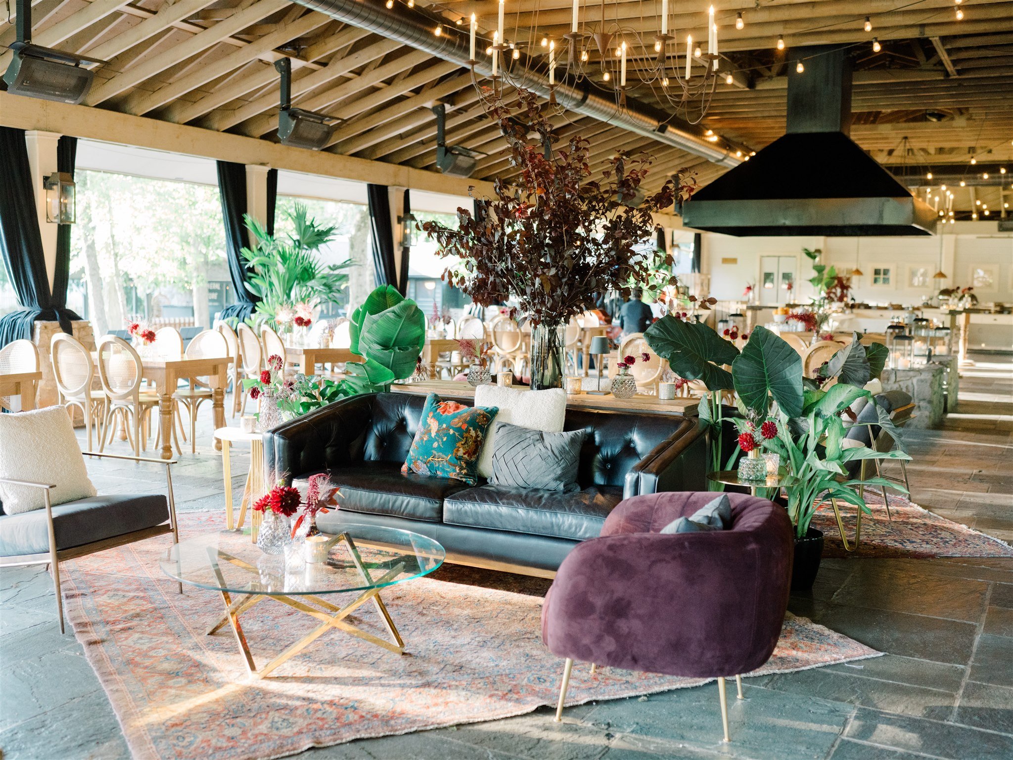 Chelsea and Joe celebrated a beautiful mid-August wedding weekend at Cedar Lakes Estate, welcoming guests with a refreshing Lavender Lemon Drop before kicking off festivities with an open-air Pavilion welcome dinner. The design leaned rich and moody—black draping wrapped the columns, tropical palms layered the space, and jazz music paired with whiskey-inspired details created a sultry Casablanca ambiance. After a private photo session, the couple joined their guests for a relaxed cocktail-style evening that ended with homemade pies and s’mores by the fire—an intimate and inviting start to the weekend.